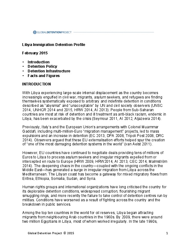 Immigration Detention in Libya 9 February 2015 Authored by: Global Detention Project Type of publication: Country Reports Download document: Libya Detention Profile 2015.pdf (332.66 KB)